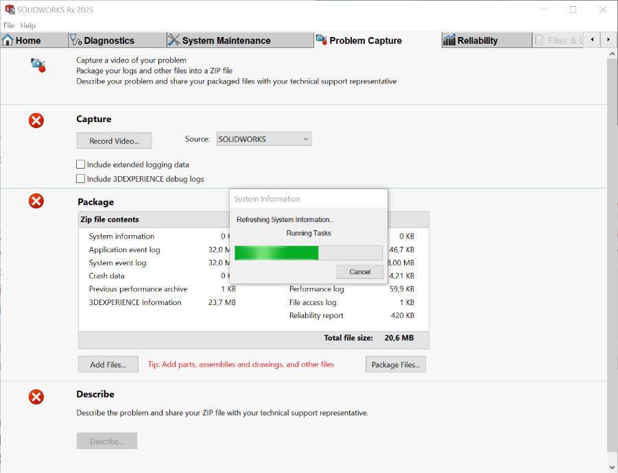 SOLIDWORKS RX is een tool die gebruikers en SOLIDWORKS-support helpt bij het achterhalen van de oorzaak van crashes, grafische problemen en om relevante systeem informatie te verzamelen.